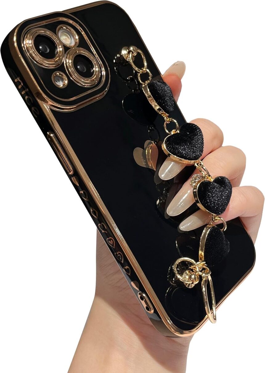 Caseative for iPhone 15 Case,Cute Plating Love Heart Wrist Strap Chain Bracelet Phone Case (Black)