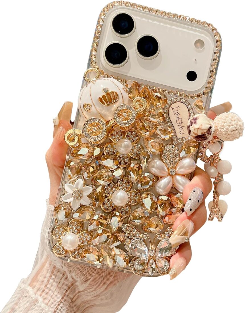 iFiLOVE for iPhone 17 Pro Max Bling Diamond Case, 3D Luxury Sparkle Glitter Crystal Rhinestone Butterfly Flower Pendant Charm Case Cover for Girls Women Kids (Champagne)