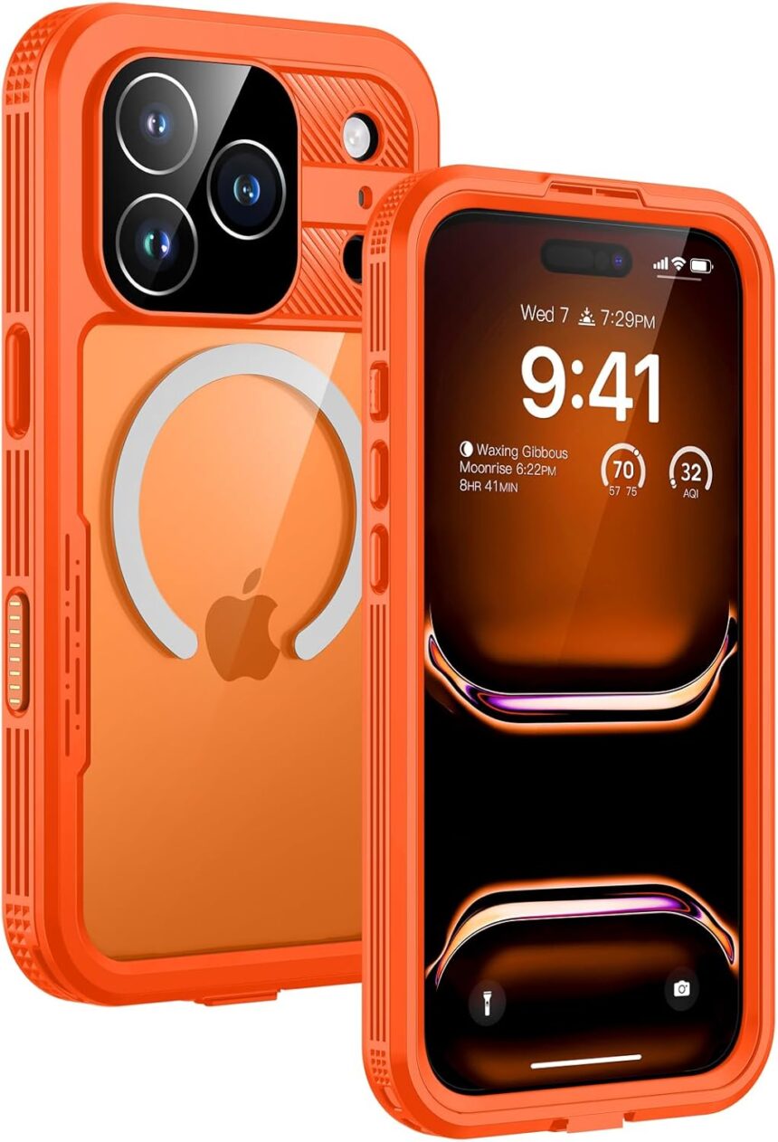 Lanhiem Magnetic for iPhone 17 Pro Max Case, IP68 Waterproof, Dustproof, Compatible with Magsafe, Built-in Screen Protector, Full Body, Heavy Duty, Rugged Phone Cover, 6.9 inch, Cosmic Orange