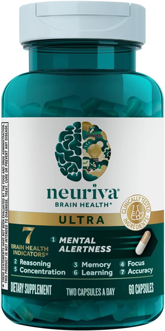 NEURIVA Ultra Decaffeinated Clinically Tested Nootropic Brain Supplement for Mental Alertness, Memory, Focus & Concentration, Cognivive, Neurofactor, Phosphatidylserine, Vitamins B6 B12, 60 Capsules