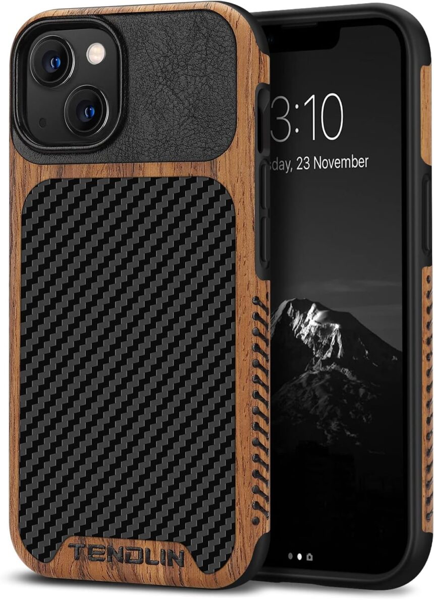 TENDLIN for iPhone 13 Case is made of natural wood veneer, PU leather and high quality Thermoplastic polyurethanes (TPU), three materials synthesis of one-piece case. Carbon fiber texture and real wood grain on the back offers good look and grip, that combine with shock absorbent TPU for reinforced toughness; Shock absorbent TPU inside provides protection against drops and shocks.