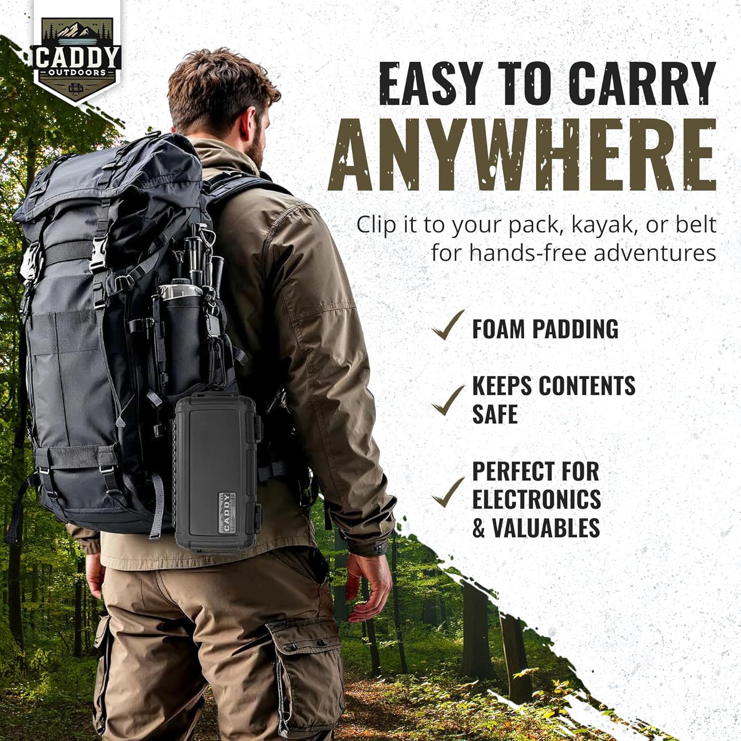 Whether you’re navigating rough trails, casting lines on the water, or prepping for the unexpected, the Caddy Outdoors Waterproof Storage Case is your compact, go-anywhere solution for keeping essentials protected and secure. Built for adventure, this heavy-duty case features a crushproof ABS body, airtight seal, and waterproof design that floats and shrugs off the elements with ease. Measuring 9″ x 4.75″ x 3″, it’s compact enough to slide into backpacks, tool kits, or glove compartments—yet spacious enough inside to carry more than you’d expect. Protective foam padding cushions and stabilizes your items, whether it’s delicate electronics, compact survival tools, or everyday must-haves. It’s the perfect fit for first aid supplies, lighters, batteries, flash drives, fishing tackle, or anything you can’t risk leaving unprotected. For added versatility, a lanyard and carabiner are included, making it easy to clip onto a bag, belt, or kayak strap for quick access when it matters most. From camping weekends and cross-country road trips to long days at the beach or unexpected emergencies, Caddy Outdoors keeps your mission-critical gear safe, dry, and within reach—ready for every adventure, every environment, and every challenge.