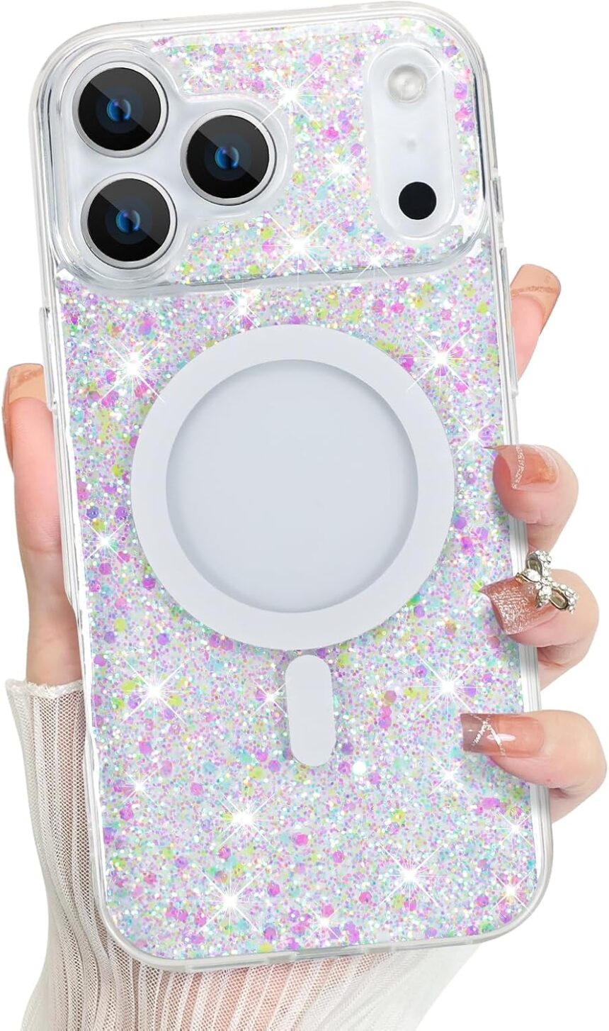 Bonoma for iPhone 17 Pro Max Case 2025 Sparkly Glitter Bling Back, Magnetic Support for MagSafe Shockproof, Crystal and Clear High-Duty Protection for Girls Women-Sparkly Glitter