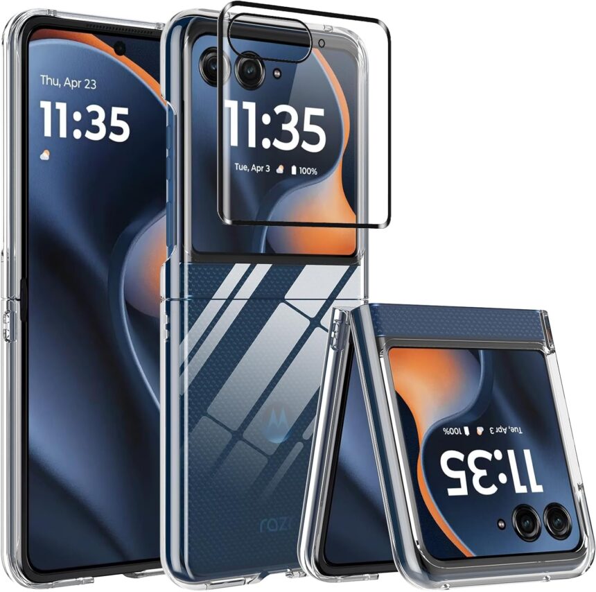 SCREEN & CAMERA PROTECTION: AFENGBOX Moto Razr 2025 Clear Phone Case includes a Tempered Glass Back Screen Protector. The 0.6mm raised edges and 1.5mm protective lips offer maximum anti-scratch and drop protection, effectively preventing scratches and collisions.