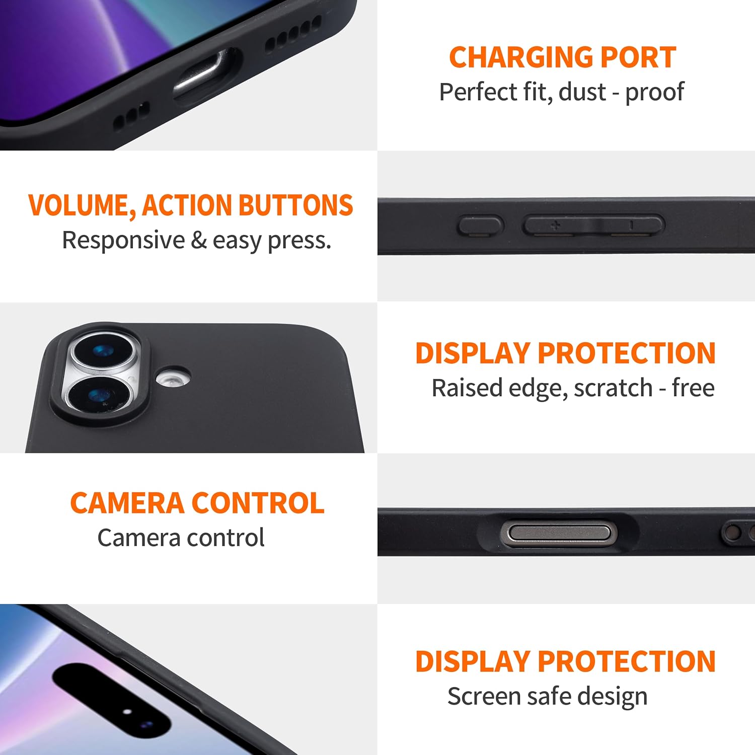 4.Slim, it fits iPhone 17’s curve, no bulk; frosted surface is anti-slip. 1:1 molded, it aligns with buttons/ports/camera, buttons feedback clearly, no need to remove for charging.