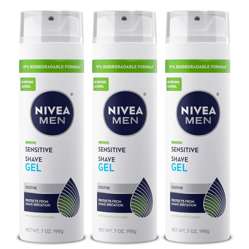 INCLUDES: Three (3) 7 ounce cans of NIVEA MEN Sensitive Shave Gel with a 99% biodegradable formula* and a can made from 100% recycled aluminum**