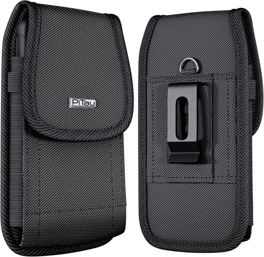 PiTau Extra Large size rugged nylon vertical cellphone holster case with belt clip is designed for all Samsung Galaxy Ultra, Note models, A series models, Google Pixel pro models, motorola moto G models and Oneplus phones. Our holster has enough room to fit the phones with protective cases on.