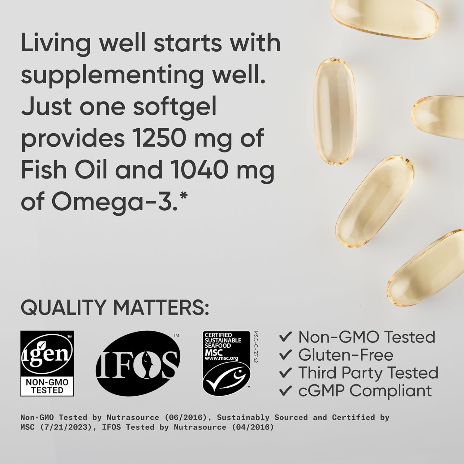 WHAT’S INSIDE – JUST ONE A DAY: Each pescatarian-friendly softgel delivers 1250mg of fish oil, providing a minimum of 1040mg of Omega-3 fatty acids in the preferred triglyceride form—with 690mg EPA and 260mg DHA per capsule. This powerful formula allows you to meet your daily omega-3 needs with just one softgel per day, eliminating the need for multiple doses or megacaps.*