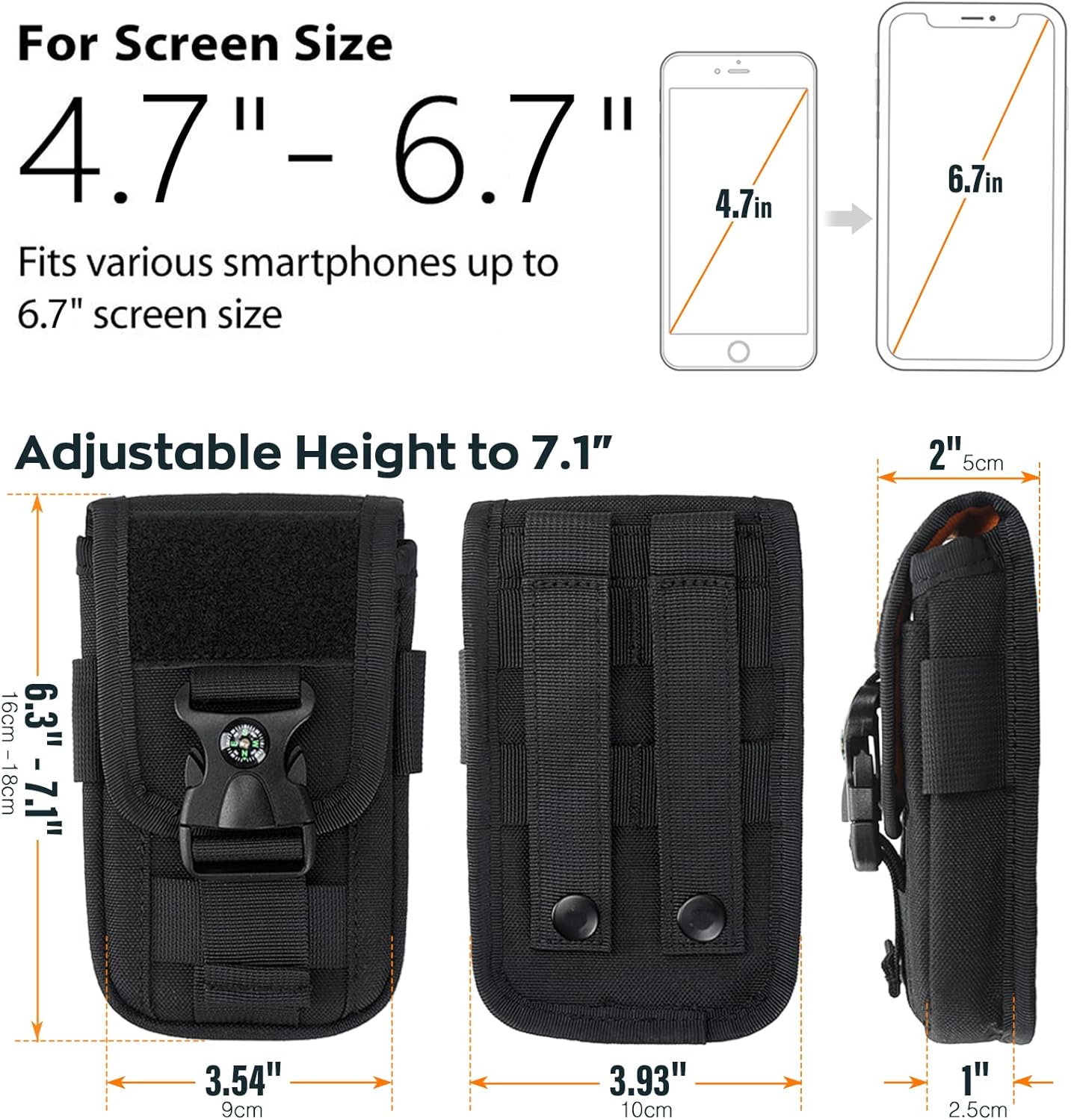 Expandable Height: Molle Phone Pouch has a front flap with adjustable height buckle strap fastening that can provide enough room for 4.7″-6.7″ cell phone with a slim protective case on. Adjustable Height: up to 18cm / 7.1 inches.