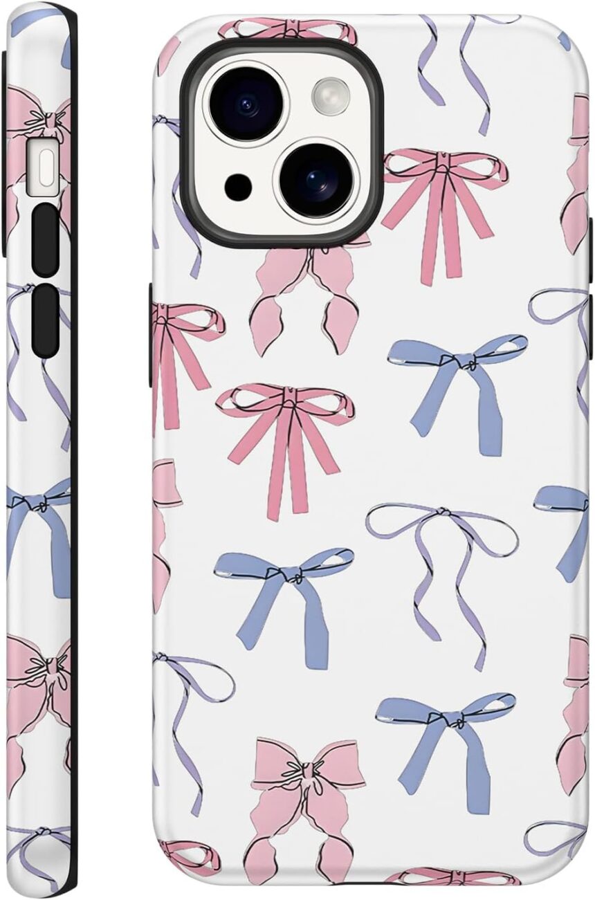Cute Bow Phone Case for iPhone 13 / iPhone 14 Case 6.1″, Pink Blue Aesthetic Coquette Preppy Ribbon Bowknot Pattern Print Design Cover Shockproof Soft TPU Hard PC Protection Girls Women Funda