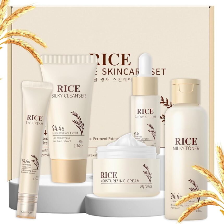 LAIKOU Skin Care Set, Korean Skin Care with Rice Cleanser, Toner, Serum, Eye Serum, Moisturizing Cream 5pcs for Women Teen Girls Mom Daughter Mother’s Day Birthday Christmas Lover Korean Beauty