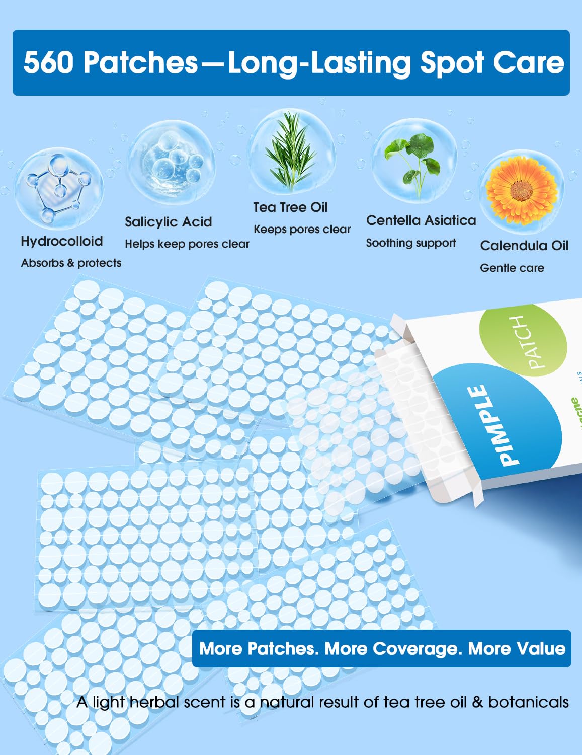 560 Patches, 6 Precision Sizes — More Sizes, More Coverage: Includes 560 hydrocolloid acne patches in 6 sizes Mini 7 mm (42), Small 8 mm (147), Medium 10 mm (98), Large 11 mm (98), X-Large 12 mm (119), XX-Large 14 mm (56). To cover everything from small pimples to larger blemishes. Easy to choose the right size for every spot — at home or on the go.