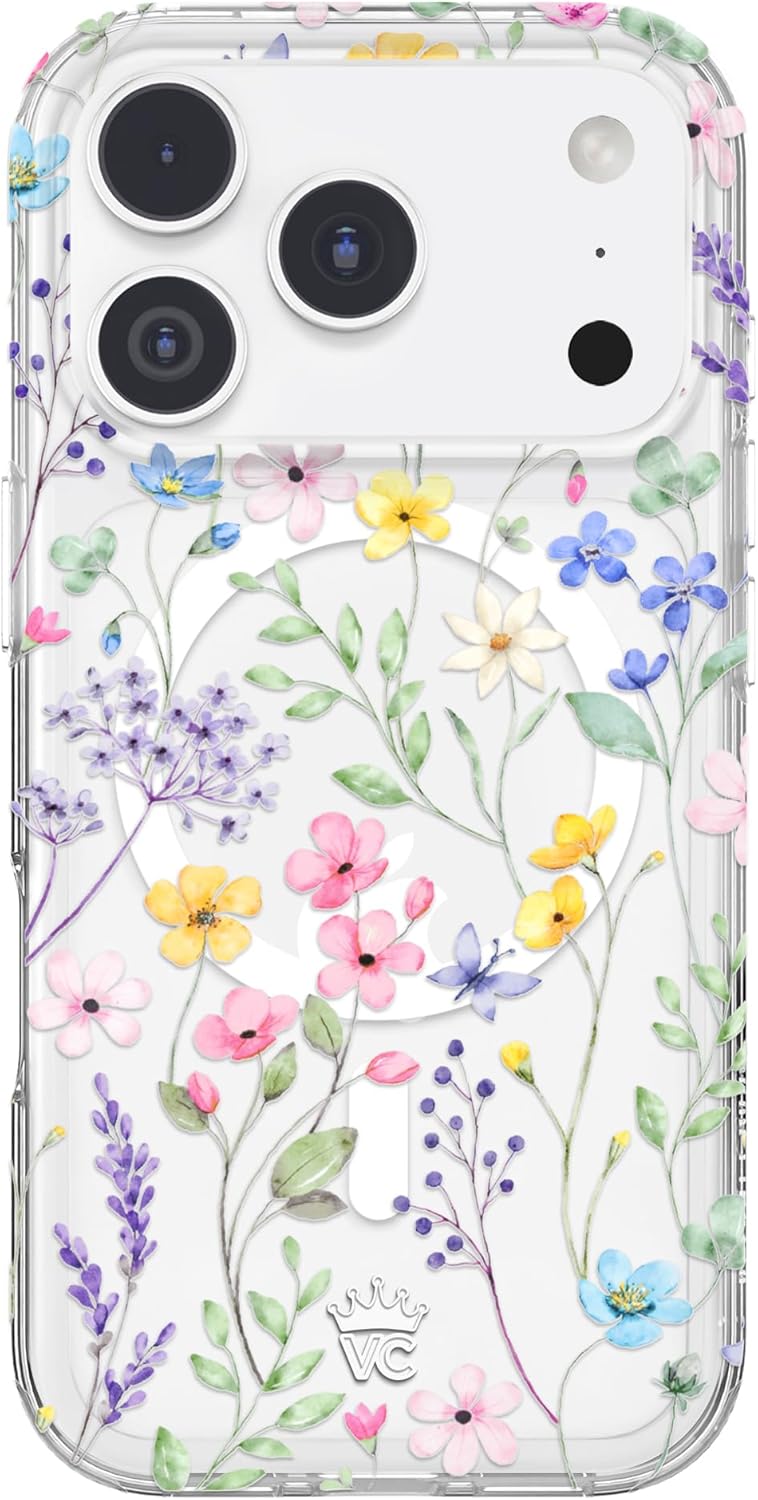 Enchanted Floral is more than just a case, it’s a fashion accessory. Flaunt your style with this unique and aesthetic phone case blooming with pastel wildflowers in pink, yellow, purple, blue, and green on a transparent clear base. The flowers are arranged in a soft sonic wave that gives the design its graceful rhythm. The pattern remains pretty, elegant, and fun while delivering full body protection you can trust. Crafted from a shock-absorbing TPU bumper and a strong PC back, this one piece case is durable and protective by design. Raised bezels around the camera and screen add extra defense against scratches, while the case is drop tested up to 10ft to help guard your phone from everyday accidents. With a magnetic back compatible with MagSafe charging and accessories, it’s easy to level up your case with our matching phone grips, wallet card holders, phone charms, or crossbody straps. Bundle your favorites for the ultimate look and added functionality. Velvet Caviar’s Enchanted Floral case: the true soul mate to your phone.
