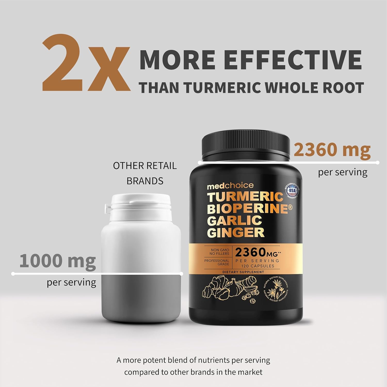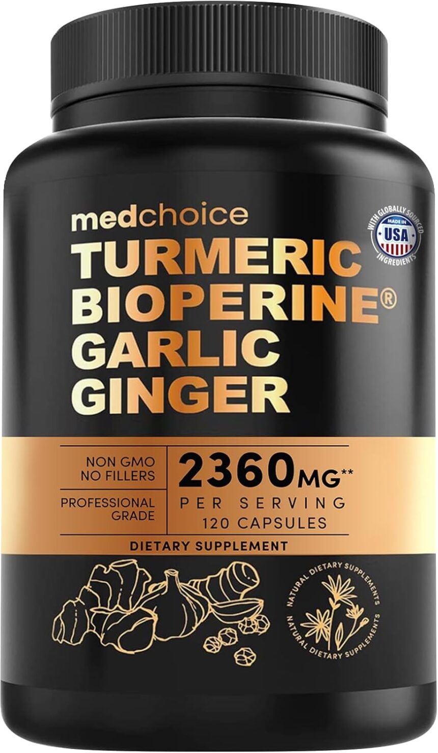 4-in-1 Functional Blend: 2360mg turmeric and ginger supplement with garlic and curcumin to support mobility, joints and cartilage, muscles and bones, and overall mobility for staying active daily.