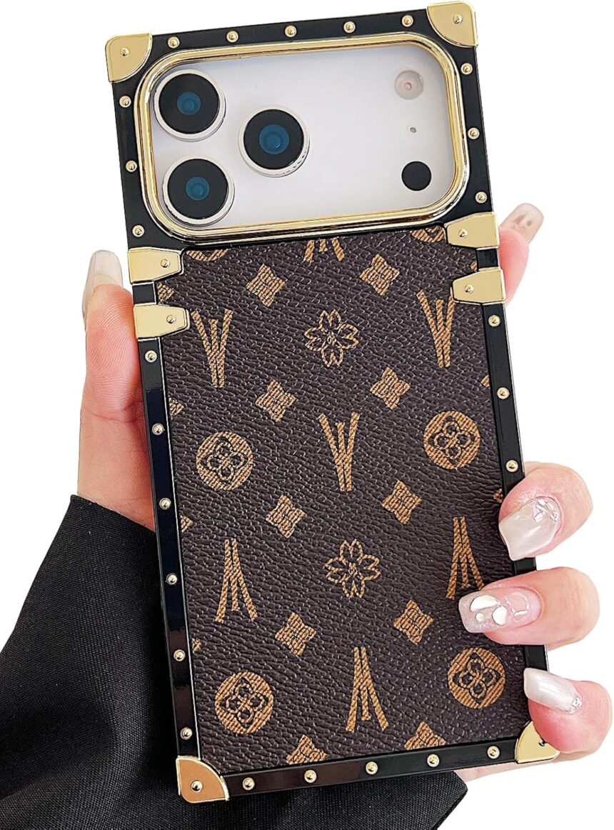 Compatible with iPhone 17 Pro Case Luxury Designer for Women Girls,Rectangle Edge PU Leather + Soft TPU Anti Drop Camera Protective Phone Cover for iPhone 17 Pro – 6.3 inch (Brown)