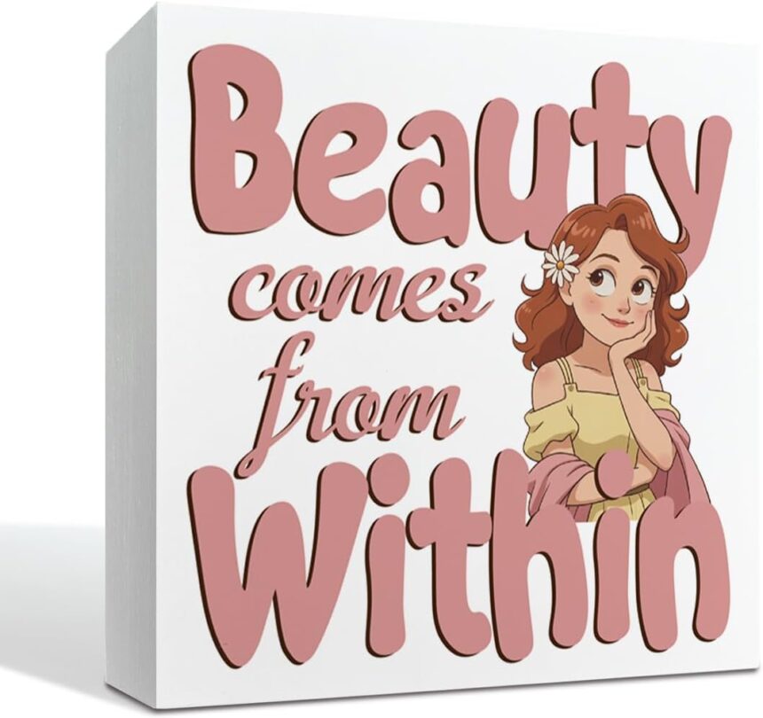 Farmhouse Desk Decor Sign, Beauty Comes from Within Inspirational Quote White Wooden Box Plaque for Bedroom Shelf Table Display, Rustic Home Office Accent Gift 5×5 Inches
