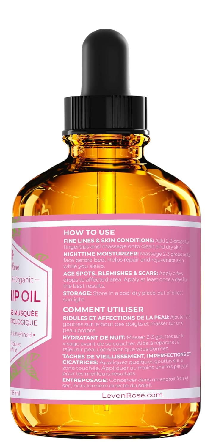 Leven Rose Rosehip Oil for Face and Body (Rosa Mosqueta) – 4 oz Glass Bottle with Dropper Leven Rose was built on a clear belief: skincare works better when it’s simple. Our Rosehip Seed Oil is made for people who are tired of long ingredient lists, overpowering scents, and products that promise miracles but never quite deliver. Sourced from rosehips grown in the mountainous regions of Chile and cold-pressed to help preserve what nature already got right, this rose hip oil is naturally rich in essential fatty acids and skin-supportive nutrients. Prized for its ability to deeply moisturize and support a healthy-looking complexion, we leave it unrefined and free from added fragrance, fillers, or unnecessary additives, so you know what you’re putting on your skin is exactly what it claims to be. Lightweight and fast absorbing, the face oil sinks in easily without leaving a greasy residue. Many people reach for it as a nighttime moisturizer, using just a few drops to help skin feel softer, smoother, and more balanced by morning. It also works beautifully as a facial oil for gua sha massage, helping tools glide smoothly across the skin without pulling or tugging. With consistent use, skin often looks more even toned and naturally radiant, without feeling heavy or overwhelmed. It’s a true do-it-all oil. Use it on dry areas of the body, including areas prone to stretch marks, fine lines, and wrinkles, smooth it over hair ends, massage it into cuticles and nails, or apply it to lips and brows for an extra layer of nourishment. Each bottle is carefully filled in-house in Colorado Springs and packaged in dark amber glass to help protect it from light and degradation, preserving freshness and quality over time. Whether you’re refining your own routine or gifting someone who appreciates clean, thoughtful skincare, Leven Rose Rosehip Seed Oil is an easy choice: simple, effective, and made to be reached for every single day.