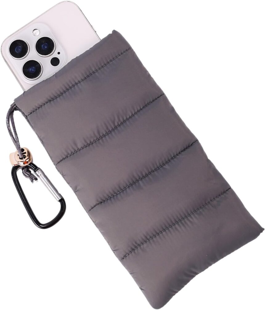 Lyreh Thermal Phone Pouch, Down Cotton Warm Phone Case Cover Bags Prevents Freezing & Overheating Protector Cellphone Pouch with Carabiner Ideal for Outdoor Camping Hiking Skiing (Grey)
