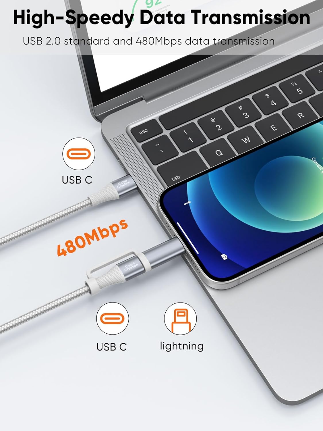 Multifunctional 2-in-1 Charging Cable: Simplify your charging setup with this versatile 6FT USB-C to Lightning Cable, featuring dual ports (USB-C to USB-C and USB-C to Lightning) to replace multiple cables. Experience blazing-fast data transfer speeds of up to 480Mb/s, transferring 1GB of files in just 20 seconds. Effortlessly sync photos, music, videos, and files between devices. With a robust 3.1A output, it ensures efficient charging for your devices. Note: Compatible with USB-C chargers only (not supported for USB-A chargers).