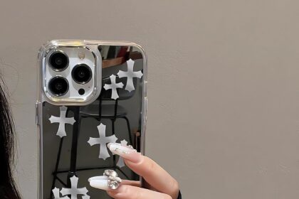 Compatible with iPhone 15 Pro Max Cute Glossy Mirror Back Case,Cross Pattern,Senior Shockproof Protection for iPhone 15 Pro Max Case for Women Girls-White