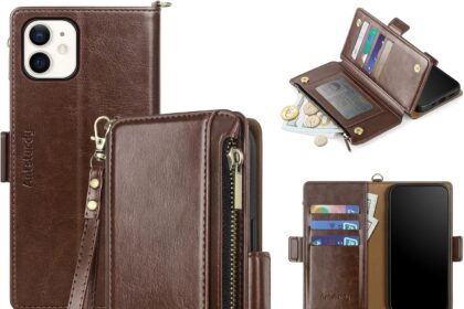 Antsturdy Compatible with iPhone 11 Wallet Case,RFID Blocking PU Leather Phone Case Women Men Flip Shockproof Protective Cover Wrist Strap Zipper Credit Card Holder Slots,for Apple 11 6.1″,Coffee