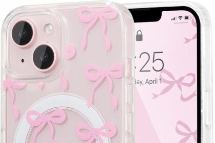 UEEBAI Magnetic for iPhone 15 Plus & iPhone 14 Plus Case, Bow Case Compatible with MagSafe, Wireless Slim Clear Ribbon Phone Cover Anti-Yellowing Shockproof Protective Cover for Women Girl- Pink | Magnetic, Wireless, Slim, Clear, Ribbon
