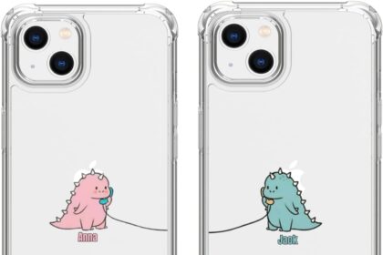 Custom Name Cute Dinosaur Couple Lovers Matching Phone Case for iPhone 17 16 15 14 13 12 11 XR Pro Max Plus Mini Case – Gift for Couple or Bestie (Clear)