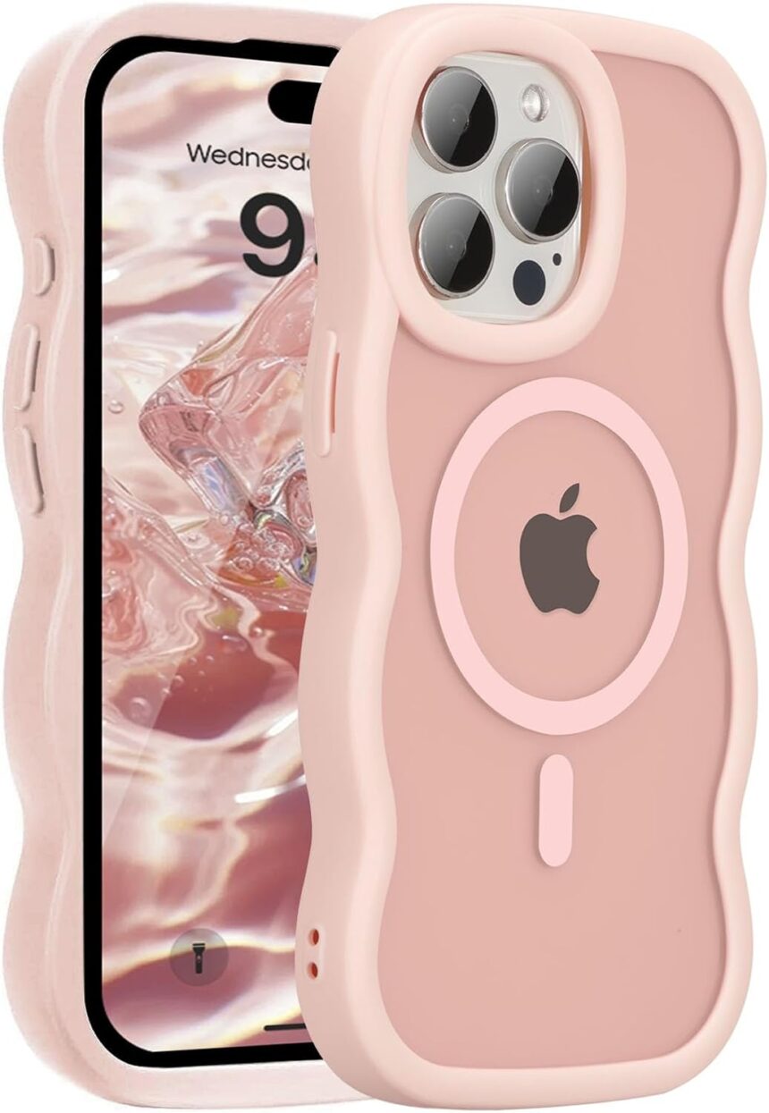 UEEBAI Magnetic for iPhone 14 Pro Case, Compatible with MagSafe, 2025 Transparent Wave Frame Design Case Soft Edge Cover Cute Clear Matte Shockproof Protective Phone Cover, Pink