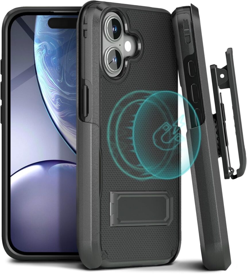 MOTIVE iPhone 16 Case with Belt Clip & Kickstand, MagSafe Compatible, Shockproof Shell Holster Combo, 6.1″ | Black V2