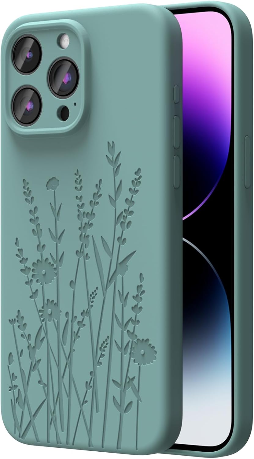 OAOA Magnetic Engraved Case Compatible with iPhone 15 Pro, Compatible with Magsafe, Camera All-Round Protection, Slim Liquid Silicone Phone Case for Women Girls, Midnight Green Flower