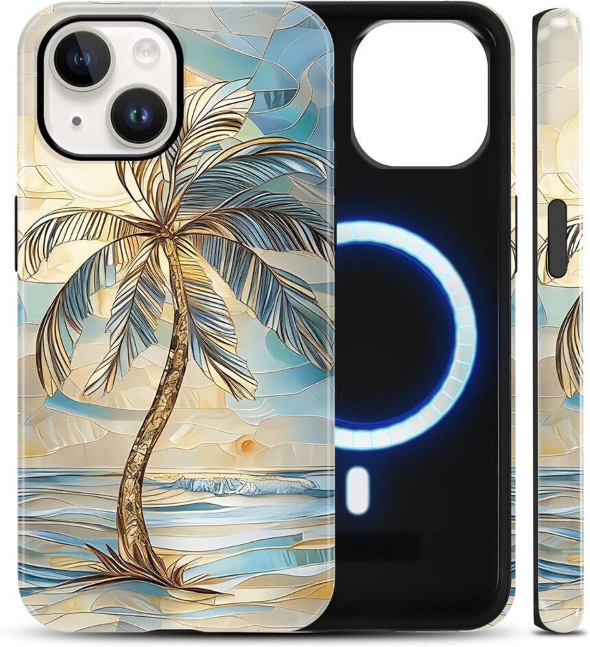Magnetic Phone Case for iPhone 14 / iPhone 13 6.1″, Stained Glass Summer Ocean Coconut Tree Beach Aesthetic Design Cover, Compatible with Magsafe, Pattern Print 2 in 1 Protection for Women Men
