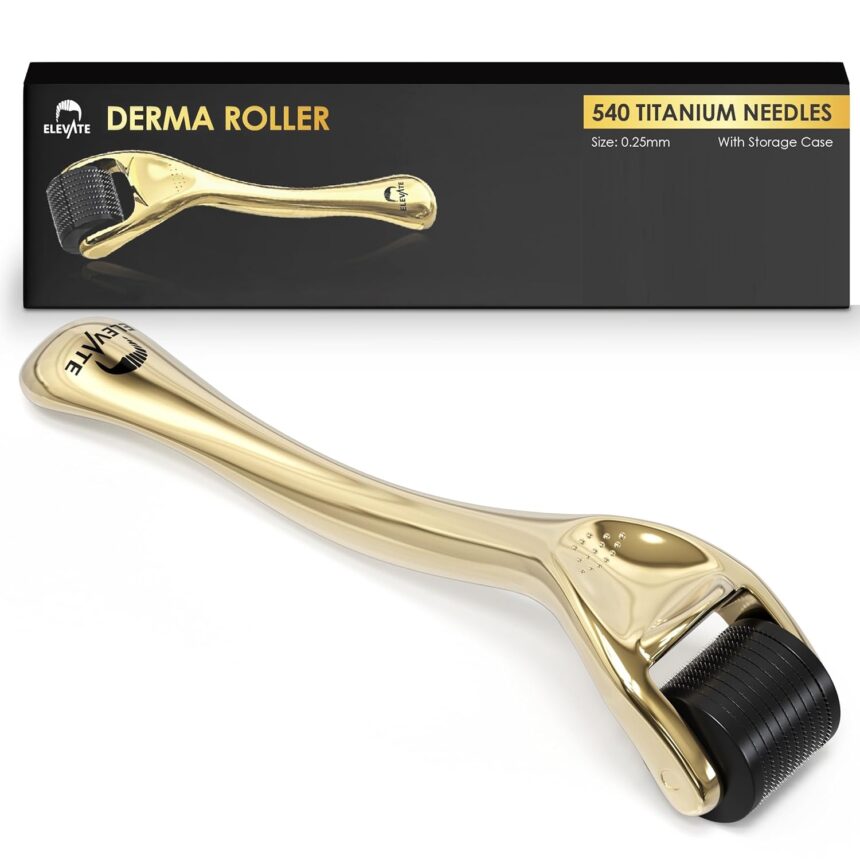 Elevate Derma Roller 0.25mm with 540 Titanium Microneedle Roller for Women & Men – Gold Roller for Face Skin Hair & Beard – Includes Storage Case