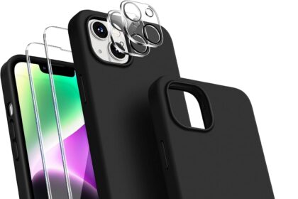 [5 in 1 for iPhone 14 Case 6.1 inch, with 2 Pack Screen Protector + 2 Pack Camera Lens Protector, Liquid Silicone Slim Shockproof Protective Phone Case (Black)…