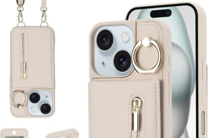for iPhone 13/14 Wallet Case with Strap Card Slot Holder RFID Blocking Ring Kickstand,Magnetic Flip Folio Zipper Crossbody Purse Case with Lanyard,PU Leather Cover Handbag,Beige