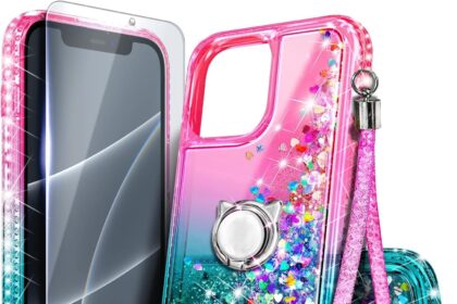 NGB Designed for iPhone 14 Case & iPhone 13 Case, Pink/Aqua | Glitter Liquid Sparkle Cute Cover for Women Girls Kids | with Tempered Glass Screen Protector & Ring Holder & Wrist Strap