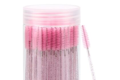 100 Pcs Disposable Mascara Wands, Crystal Eyebrow Spoolies Brush for Eyelash Extensions, Pink Lash Brushes with Container