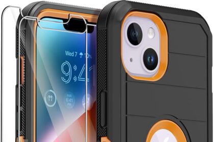 Annymall for iPhone 14 Case with 2 Screen Protector,Full Body Shockproof Drop Protection Dust Proof Heavy Duty 3-Layer Rugged Durable Military Grade Cover for Apple iPhone 14 6.1″ (Black/Oranger)