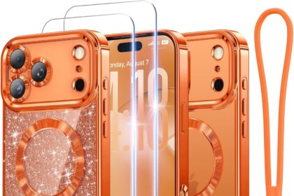 Meifigno Designed for iPhone 17 Pro Max Case 6.9″, [Glitter Card & Wrist Strap] [Compatible with MagSafe] [2X HD Screen Protectors] Surround Raised Lens Protection for 17 ProMax Case, Cosmic Orange