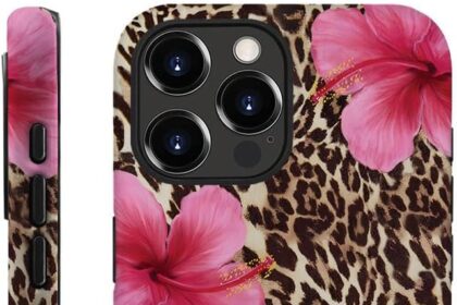 Case Compatible with iPhone 14 Pro Max,Scratch Resistant Hybrid 2-Layer Hard Shell Phone Case,Leopard Pink Hibiscus Tropical Floral