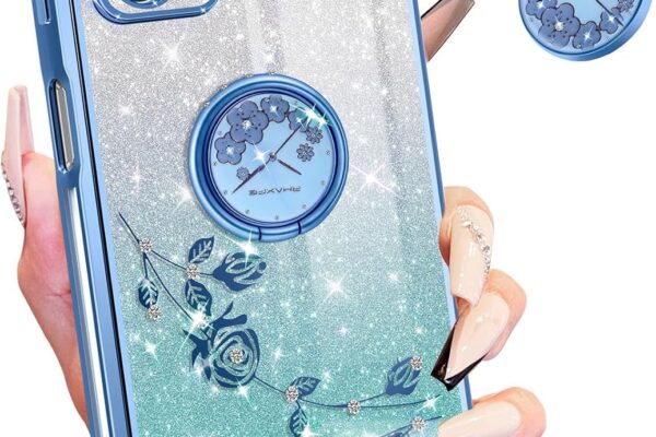 Likiyami (3in1 for Samsung Galaxy A32 5G Case for Women Girls Glitter Girly Cute Bling Flowers Blue Phone Cases with Ring Stand Design Sparkle Floral Shiny Pretty Cover for Samsung A32 5G 6.5”