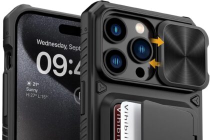 Vihibii for iPhone 15 Pro Max Case with Card Holder (4 Cards) & Slide Camera Cover & Kickstand, Military Grade Drop Protection, Rugged Hard Back & Silicone Edge Wallet Phone Case, 6.7″ 2023, Black