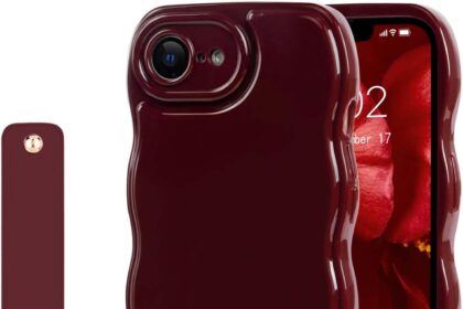 NITITOP Compatible with iPhone 16e Case Cute Simple Wave Design Stylish Wavy Curly Frame with Wrist Adjustable Hand Strap Kickstand Grip Holder Soft Silicone Protective Cover – Wine Red