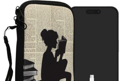 kwmobile Neoprene Sleeve for Smartphone Size XXL – 7″ – Shock Absorbing Pouch Case – Protective Phone Bag – Girl and Books Black/Beige