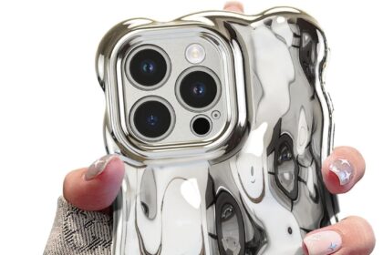 UEEBAI Ripple Case for iPhone 15 Pro Max, Cute Silver Cover Wave Shape for iPhone Case Pretty Aesthetic 3D Phone Cover, Water Ripple Shell 3D Chrome Design for Women and Girl, Silver