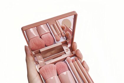 5-Piece Professional Makeup Brush Set with Mirror & Travel Case Hypoallergenic Vegan Bristles for Sensitive Skin Luxury Gift-Ready Box,Portable Cosmetic Kit for Brides,Travel,On-the-Go Touchups (Pink)