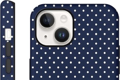 Case for iPhone 13, Glossy Hybrid 2-Layer Hard Shell, Aesthetic Scratch Resistant Cover, Navy Blue Polka Dot