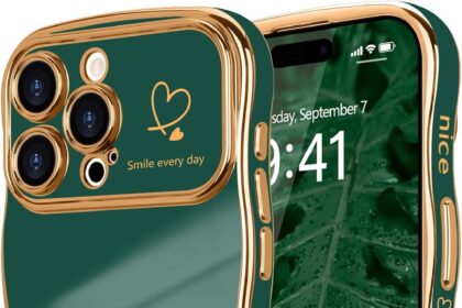 LCHULLE for iPhone 16 Pro Case for Women Girls, Cute Wave Frame Curly Shape with Love Heart Pattern Raised Camera Protection Cover Luxury Plating Shockproof Phone Case for iPhone 16 Pro, Dark Green