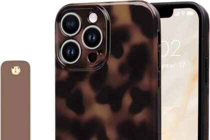 NITITOP Compatible with iPhone 14 Pro Max Case with Wrist Strap Cute Stylish Leopard Aesthetic Tortoise Amber Design for Women Girls Men Soft TPU Shockproof Protective Cover – Brown