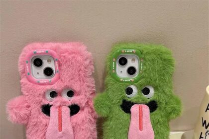 Funny Tongue Sticking Out Plush Mobile Phone Case, Couple Case Cute,Warm Spoof Tongue Interactive Monster Fur Cover for iPhone (for iPhone 15 Pro Max,Pink+Green)
