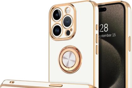 Hython for iPhone 15 Pro Case with Ring Stand, 360° Rotatable Ring Holder Magnetic Kickstand, Plating Rose Gold Edge Soft Cover Luxury Protective Phone Case for iPhone 15 Pro 6.1″, White